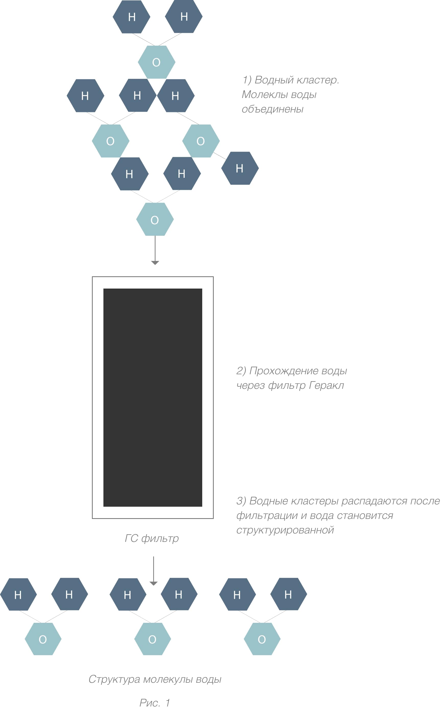 Диаметр каналов, по которым просачивается вода при ГС-фильтрации около 100 нанометров. Это значит, что Геракл фильтры разбивают водные кластеры, через эти каналы кластер размером более 100 нанометров не пройдет. Вода становится низкомолекулярной
